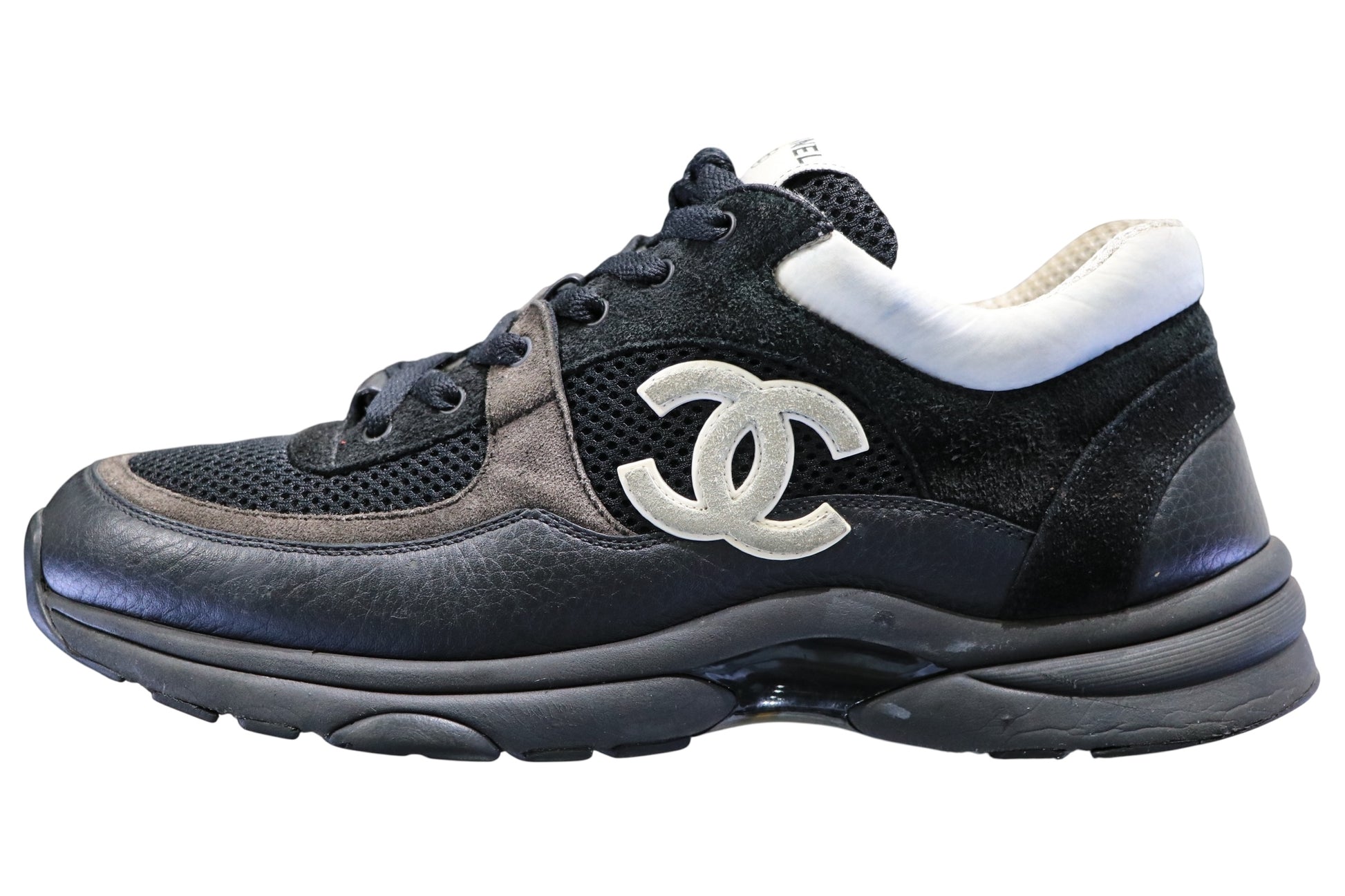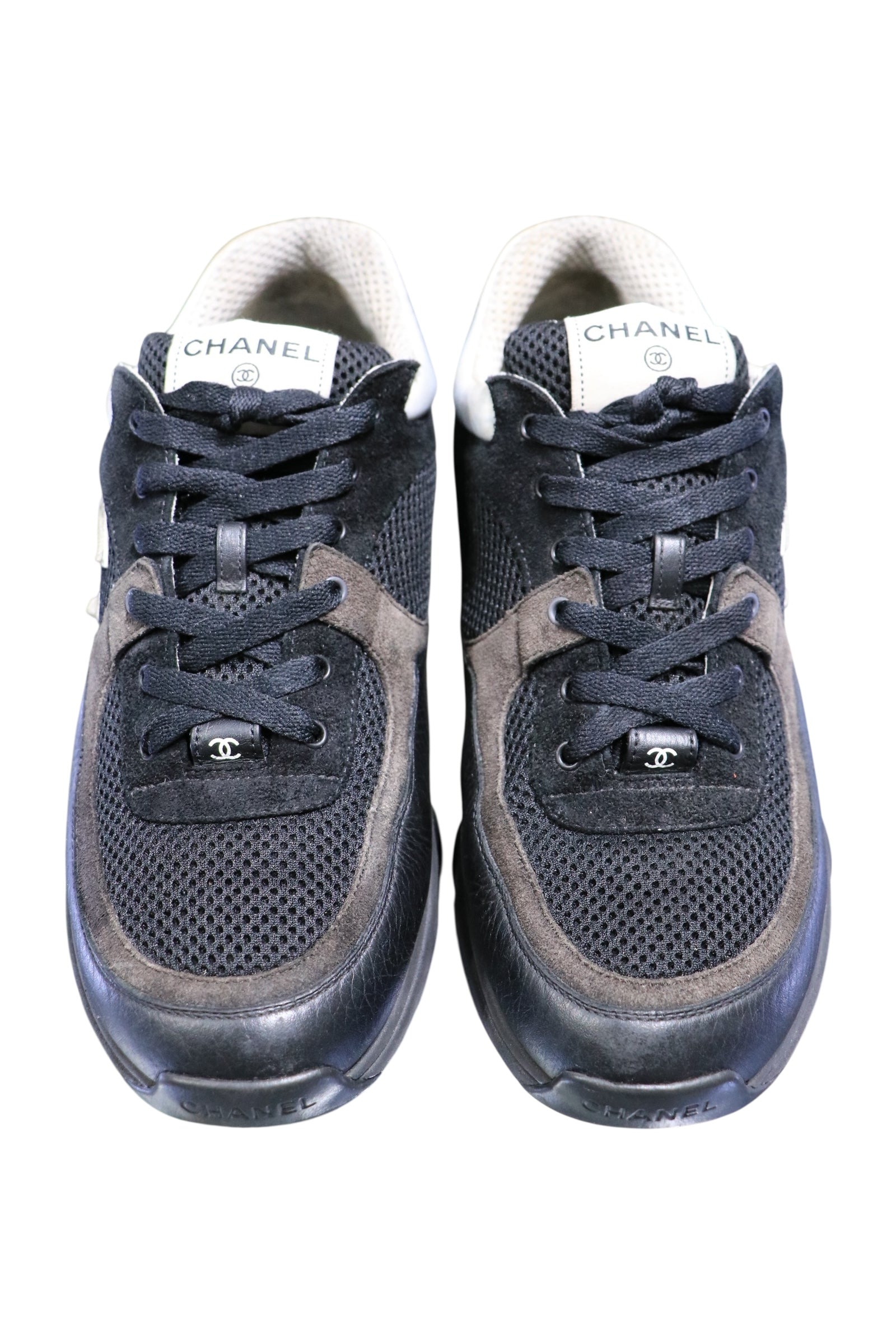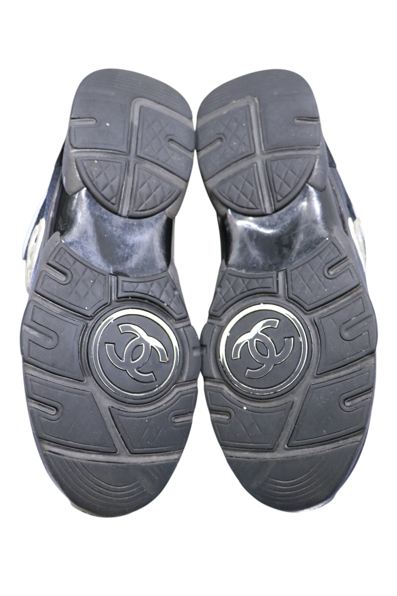 This item is in fair pre-owned condition; without box. Wear present on outsoles, insoles, some discoloration on white fabric at heels, and peeling of CC logo present.
